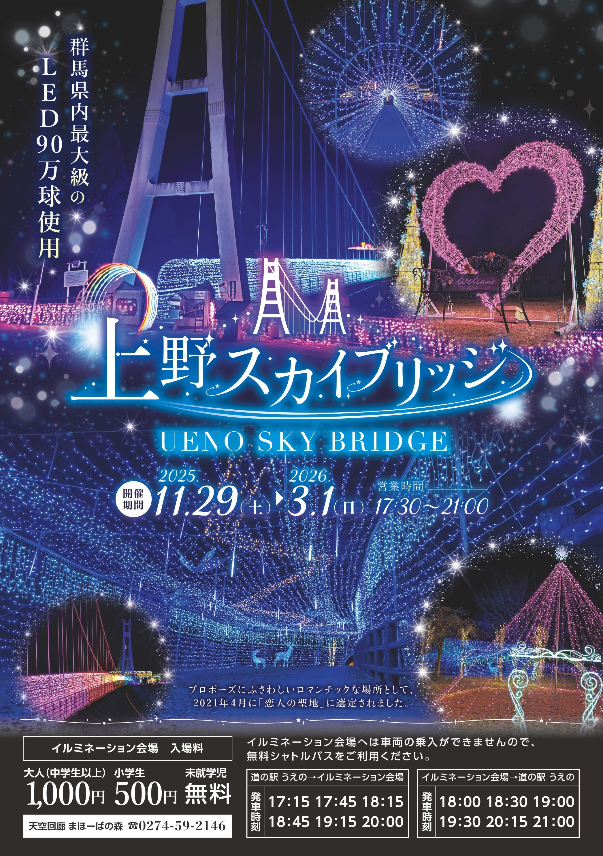 群馬県内最大級90万球のLEDが夜空に★きらめく★ 上野スカイブリッジイルミネーションをこの冬も開催します。 会場へは自家用車の乗入れできませんので、「道の駅上野」発着の無料シャトルバスをご利用ください。 バスが到着する... 続きを見る