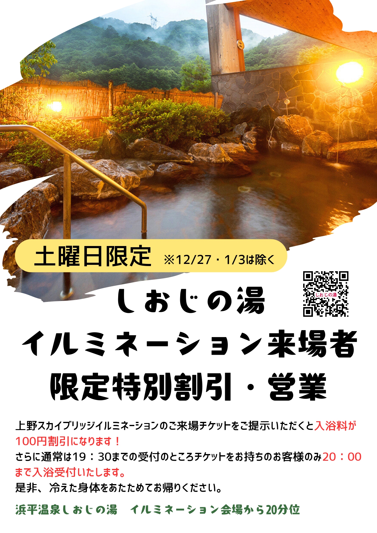 イルミネーションをご利用頂いたお客様限定で、 しおじの湯の特別割引&入浴受付時間延長でご利用いただけます。 イルミネーション来場チケットを、しおじの湯で提示するだけ 入浴料100円引き 受付時間 通常19時半のところ、2... 続きを見る