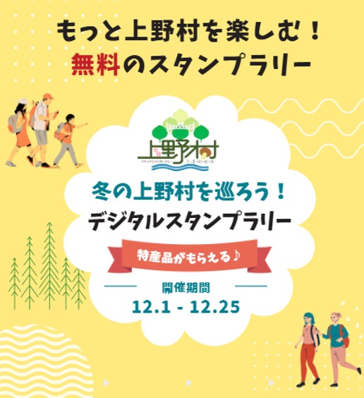 冬の上野村を巡て、上野村の特産品をもらおう。 上野村デジタルスタンプラリー <開催期間>2025年11月25日〜2025年12月25日 お手持ちのスマートフォンを使って、村内の観光スポットを巡りましょう。 参加は無料、ど... 続きを見る